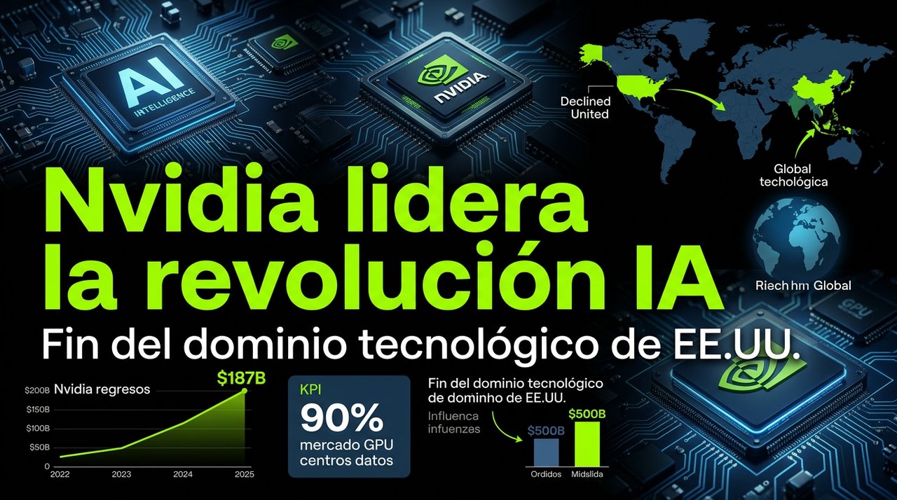 El liderazgo de Nvidia en IA transforma negocios globales. Controla el 90% del mercado de GPUs para centros de datos, impulsando inversiones de $500 mil millones en infraestructuras en 2026. Para profesionales de tecnología y negocio, significa oportunidades en computación acelerada, pero también riesgos geopolíticos con el declive del dominio estadounidense.